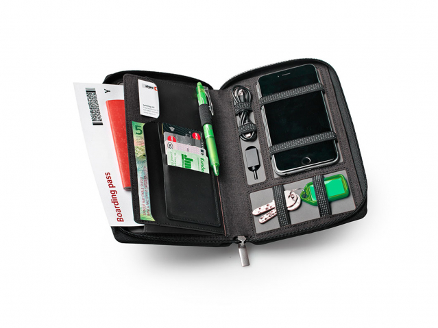 Praktische Reisemappe für unterwegs mit integrierter Powerbank (4000 mAh) und mitgeliefertes Micro-USB-Kabel um Ihr Smartphone oder Tablet während der Reise aufzuladen. Mit umlaufendem Reissverschluss und abnehmbarer Handschlaufe. Diverse Fächer für die Ablage von Kleinmaterial sowie Einsteckfächer für Kreditkarten, Visitenkarten, etc. sind vorhanden. Ein grosses Fach für Smartphone (bis 6‘) sowie eine seitliche Tasche für das Verstauen von Pass oder Reiseunterlagen ergänzt diese Reisemappe. Auf der Vorderseite steht eine zusätzliche Einschubtasche für Unterlagen oder Smartphone zur Verfügung. Die Reisemappe ist aus strapazierfähigem, wasserabweisendem Textilmaterial.