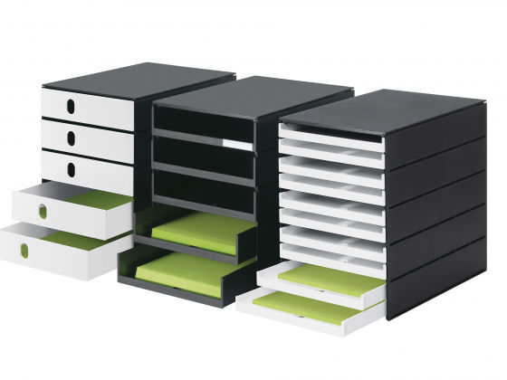 Im trendigen «black & white» Design. Lieferung inkl. Beschriftungsmaterial. Gehäuse und Schubladen in schwarz aus 100% Polystyrol-Regenerat, weisse Schubladen aus Neumaterial gefertigt. Xtra-slim nur 243 mm breit, daher ideal passend für Metallmöbel und Regale. Zwei unterschiedliche Elementhöhen sowie drei verschiedene Schubladenversionen stehen zur Auswahl - ganz auf Ihre Bedürfnisse abgestimmt. Die Schubladenfronten sind matt poliert. Leichtgängige und herausnehmbare Schubladen. Für Formate bis C4.